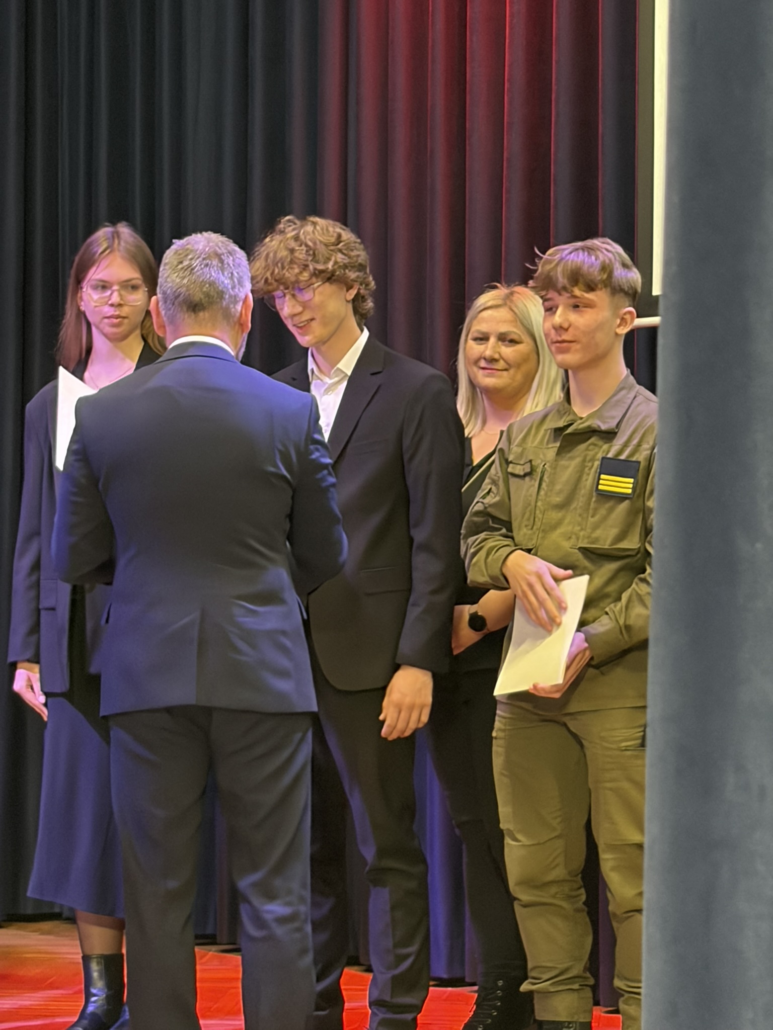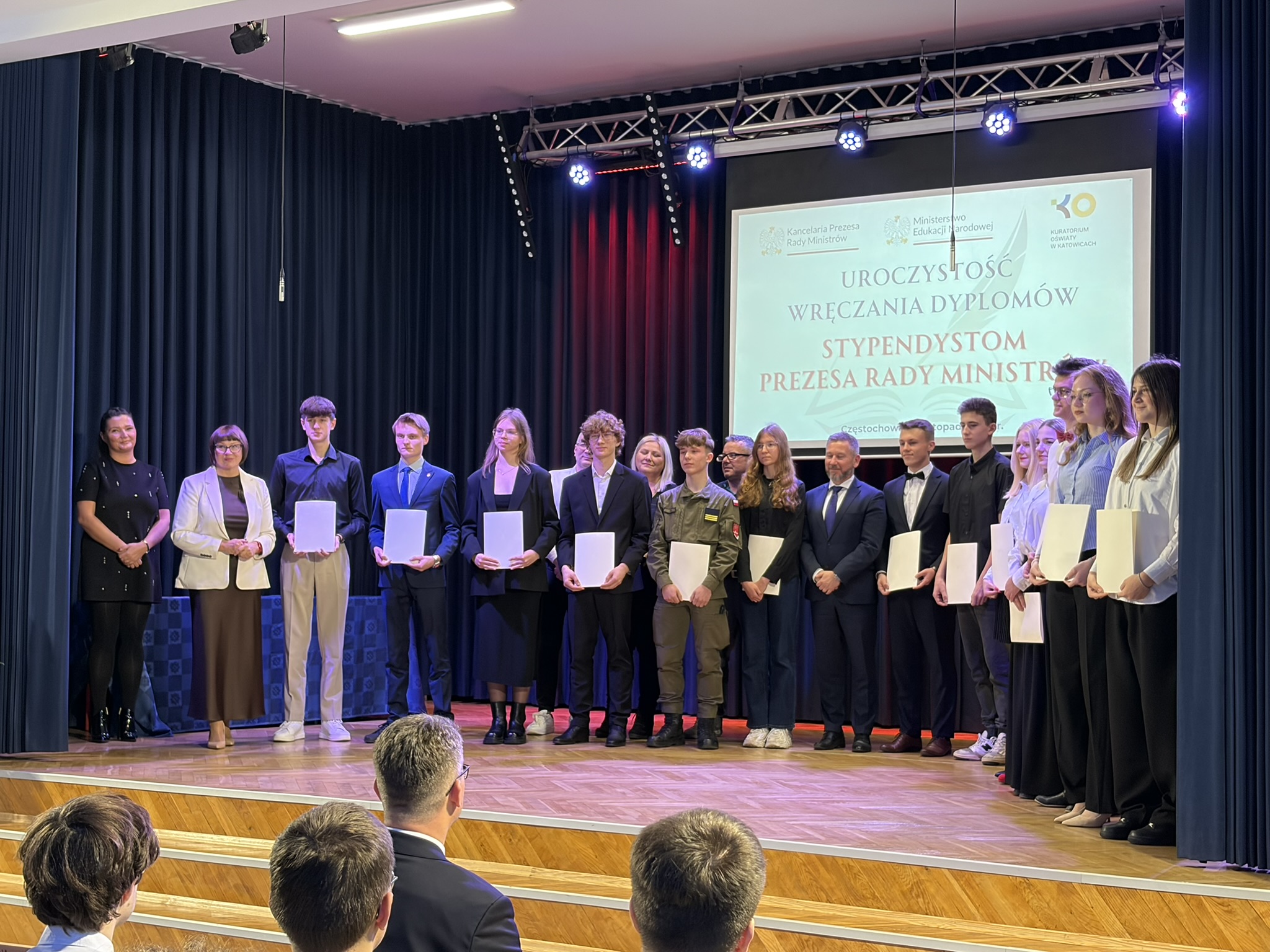 14 listopada w V LO im. Adama Mickiewicza w Częstochowie, odbyło się wręczenie stypendiów Prezesa Rady Ministrów. Nagrodzonym uczniom regionu częstochowskiego stypendia wręczali Pani Barbara Matczak, Zastępca Dyrektora Częstochowskiej Delegatury Kuratorium Oświaty oraz Pan Adam Zaczkowski, I Wicewojewoda Śląski. Stypendia Prezesa Rady Ministrów są przyznawane uczniom szczególnie uzdolnionym, mającym wybitne wyniki i sukcesy w nauce. Miło nam poinformować, że wśród nagrodzonych jest uczeń naszej szkoły Hubert Trzciński z klasy 4g. Naszą szkołę reprezentował Pan Dyrektor Marcin Terka.
