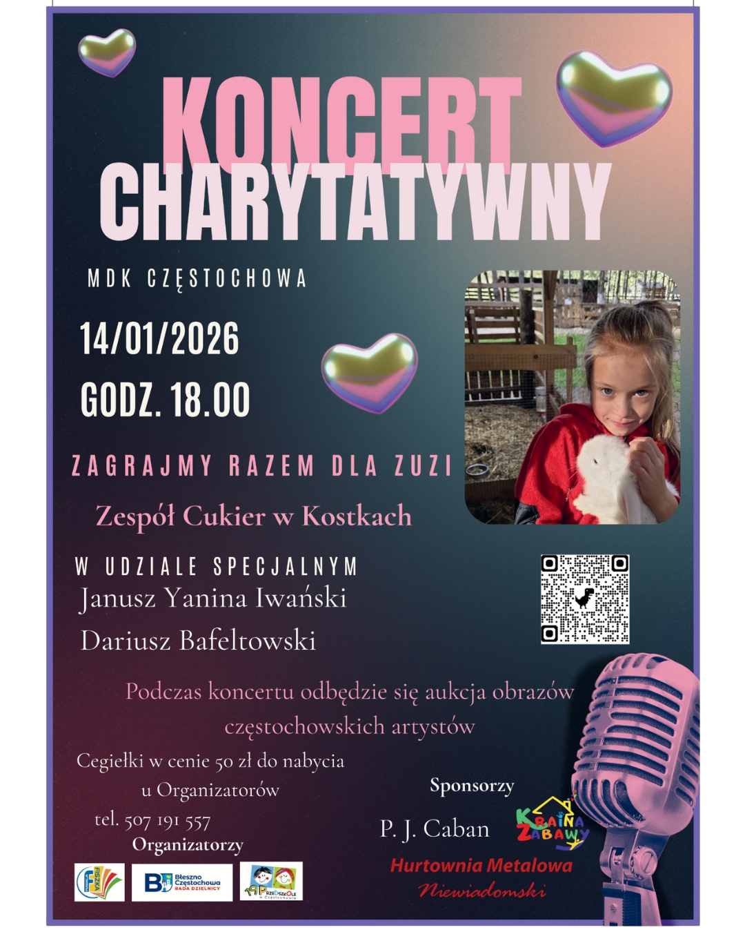 W imieniu organizatorów serdecznie zapraszamy do udziału w Koncercie Charytatywnym dla Zuzi Wypych, u której rozpoznano glejaka mózgu. Wydarzenie odbędzie się 14.01.2026r (środa) o godz. 18.00 w Miejskim Domu Kultury ul. Łukasińskiego 50/68. Koncert będzie miał charakter świąteczny, radosny i optymistyczny bo taka energia ma popłynąć z nadzieją do Zuzi.